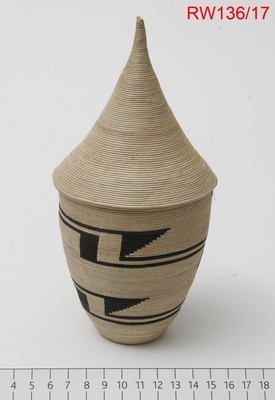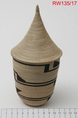Der sehr fein gearbeitete Korb dient als Geschenk und Dekoration, besonders zu Hochzeiten werden Geschenke oft in besonders schön gearbeiteten Körben überreicht. Die Arbeit an so feinen Körben wie diesem kann bis zu drei Monate dauern. Auf der Unterseite ist der Korb nicht eben, sondern leicht nach innen gewölbt. Das Muster besteht aus zwei parallelen schwarzen Linien, die regelmäßig in einer schwarzen schrägen Linie zurück einie Reihen nach unten gehen. Die Form erinnert an ein Z. Das Muster heißt: Amaraza (der Schielende) Der Decke ist ungefärbt und spitz. Deckel und Korb sind durch einen schwarzen Faden verbunden. Der Korb wurde von einer der Frauen hergestellt, die am ethnographischen Museum in Huye ausgebildet wurden, wie alle Agaseke Uruhindu und Intago.