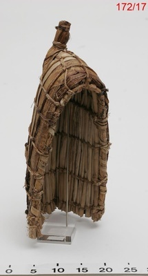Dieser Regenschutz wurde früher von Hirten und Fischern genutzt, um sich vor schlechtem Wetter zu schützen (van Pee, Célestin 2009: 70). Dieses Exemplar ist von der Größe her für Kleinkinder geeignet. Der Isinde besteht aus überwiegend hellbrauner Bananenrinde, innen aus runden zuwammengeflochtenen Rindenstücken (gerollt?). Außen sind die Rindenstücke flach überlappend ausgebreitet. Darüber ist ein Netz, ebenfalls aus Banenenrinde. Oben ist noch ein Knauf.