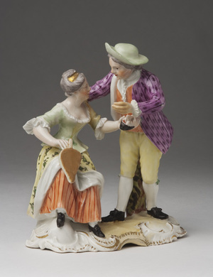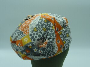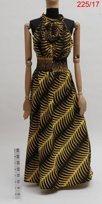 Das Kleid ist für ein kleines Mädchen gedacht. Es ist knielang, schulterfrei und hochgeschlossen, mit einem kleinen Kragen. Darunter ist ein kleiner tropfenförmiger Ausschnitt. An der Taille sitzt eine Schleife. Das Kleid wird über einen beigen Reißverschluss am Rücken geschlossen. Der Stoff ist Rot-Gelb-Orange gestreift, wobei das Gelb und Orange ein Batikmuster auf weißem Grund sind. Darüber liegt ein Muster aus durch schwarze Striche verbundenen schwarzen Quadraten. In der Mitte dieser ist jeweils ein weißer Punkt, umgeben von kleineren weißen Punkten.
