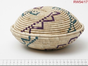 Miniaturkorb aus Sisal, blau eingefärbt. Der Korb besteht aus zwei Hälften, die durch ein Sisalband miteinander verbunden sind. Eine der Hälften hat ist in dem Teil, der von der anderen Korbhälfte bedeckt wird etwas schmaler. Beide Hälften haben einen kleinen Henkel, sodass der Korb sich aufhängen lässt. Der Korb wurde in einer Technik hergestellt, bei der einzelne Faserstränge umwickelt und zusammengefügt werden.