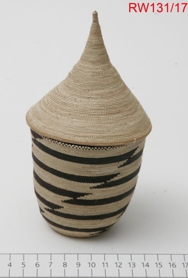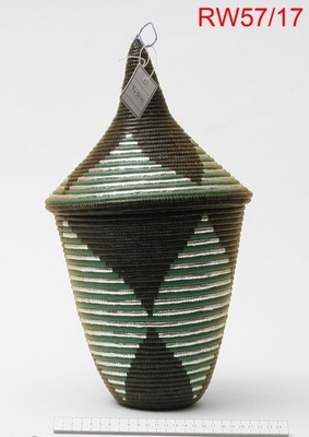 Ein Korb in Form einer Vase, mit einer breiteren Unterenhälft und einem etwas schmalerem Hals. Der Korb ist mit Kunststoffband umflochten, allerdings nicht so, dass der innere Teil verdeckt wird (Inshinge: Stroh oder Liebesgräser), sondern nur so, dass es fest ist, der Innenteil aber noch gut sichtbar ist.