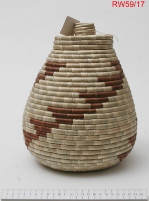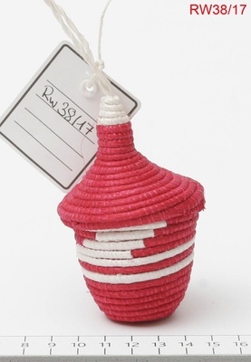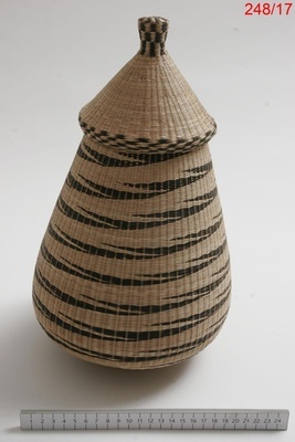 Der Korb hat eine leicht bauchige Form und einen relatativ flachen Deckel mit einem runden Griff. Der Innere Teil besteht aus Inshinge (Übersetzungen: Liebesgräser / Stroh), umwickelt ist der Korb mit Intaratara (ein Zyperngras: Cyperus Latifolius). Der Deckel ist einfarbig in dem beige des Grases, der Korb selbst hat schräge Streifen aus braun gefärbtem Material (Möglicherweise ein anderes). Die Basis ist wiederum einfarbig.
