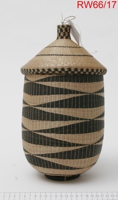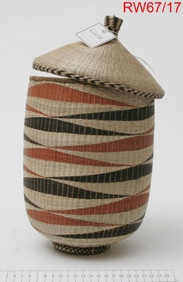 Dieser Korb besteht im Inneren aus einem Gerüst aus Bambus oder Papyrus welches dann mit gespaltenem Gras (Intaratara = Cyperus Latifolius) umflochten wird. Traditionell sind in der ruandischen Flechtkunst Männer für größere/ gröbere Arbeiten zuständig, weshalb oft der Innenteil von Männern und der feine äußere Teil von Frauen gearbeitet wird. Ob dies hier auch der Fall ist, lässt sind nicht sagen. Der Korb steht auf einem kleinen, an vier Stellen angebundenem Ring, der mit schwarz gefärbtem Gras umwickelt ist. Das Muster des Korbes besteht aus langgezogenen Rauten übereinander, auf einer Seite des Korbes Schwarz, auf der anderen Rot. Der Rest des Korbes ist naturbelassen. Der Deckel hat am Rand und am Knauf ein schwarz/naturfarbenes Karomuster.