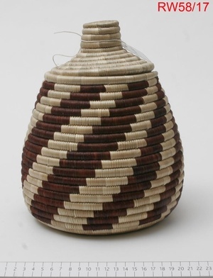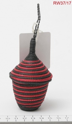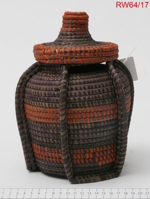 In solchen Köchern wurden / werden Strohhalme aufbewahrt, mit denen man aus der Kalebasse getrunken (zumindest in Städten nicht mehr üblich) oder Milch umgerührt hat. Der Igitembo besteht aus Halmen (Papyrus?), die mit einem anderem Material (Zyperngras?) umwickelt und mit einem Kunststofffaden festgeflochten wurden. Der Köcher ist unten und oben am Deckel dunkelgrün und hat an drei Stellen drei Dunkelgrüne Streifen (nach ca. 1/3, ca. 2/3, und ganz oben). Auch der Deckel hat am Rand einen grünen Streifen. Oben am Deckel ist eine Schlaufe angebracht.
