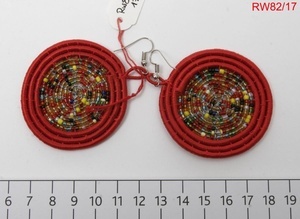 Die Ohrringe bestehen aus Scheiben, die mit Stoff (Kitenge, ein bunt gemusterter Wax-Print) bezogen wurden. Vermutlich befindet sich im inneren ein platt gehämmerter Kronkorken. Der Stoff ist an einem Ohrring zum größeren Teil rot mit weißen Streifen, ein kleinerer Teil ist grün mit roten Streifen. Sie sind über einen Faden mit dem Ohrhänger verbunden. An diesem Faden sind an einem Ohrring 5 metallisch schimmernde Perlen und am anderen 7 größtenteils gelbe Perlen aufgefädelt.