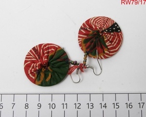 Der Anhänger der Kette besteht aus Scheiben, die mit Stoff (Kitenge, ein bunt gemusterter Wax-Print) bezogen und auf der Rückseite mit blauem Faden zugenäht wurden. Vermutlich befindet sich im Inneren je ein platt gehämmerter Kronkorken. Der Stoff ist überwiegend grün mit orangenen, lila und, roten und weißen Details. Nur der Kreis ganz in der Mitte ist rot mit weißen Streifen. Der Rest der Kette ist zweireihig mit goldenen Perlen, im inneren befindet sich ein brauner Faden. Als Verschluss befindet sich an einem Ende ein Knoten, am anderen Ende eine Schlaufe.