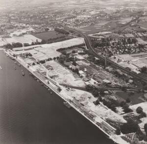 Schwarzweißfotografie. Dieses Luftaufnahme von 1957 zeigt den Bendorfer Rheinhafen, die dort angesiedelte Firma Dr. Otto mit dem 1916 erbauten Wasserturm, der heute noch erhalten ist. Außerdem sind mehrere Schwemmsteinfabriken (u.a. Schwemmsteinfabrik Frankfurt a. M. auf dem ehemaligen Gelände der Mülhofener Hütte) zu erkennen. Hinter dem Hafengelände ist die Bahnstrecke, die Kastell-Siedlung und schließlich im Hintergrund mit rauchenden Schornsteinen die Concordiahütte in Bendorf-Mülhofen zu erkennen. Rechts hinter der Bahnlinie ist außerdem die ehemalige Maschinenfabrik Syré zu sehen.