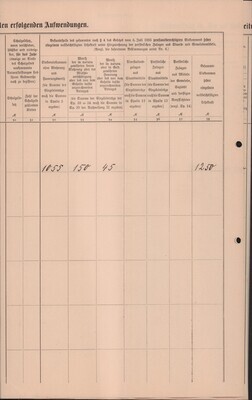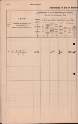 Im Nachweis III. diente dazu alle zur Bestreitung der persönlichen Kosten der öffentlichen Volks- und Mittel- sowie der höheren Mädchenschulen erfordenden Aufwendungen zu erfassen. Auf Seite 1 ist beschrieben wie und was zu erfassen sei. Im Innenteil in Spalte 2 die Art der Schule, Spalte 2 die Stelleneinkommen, Spalte 6 den aus der Kirchenkasse gezahlten Anteil, Spalte 8 den aus der Gemeindekasse oder Stiftungen beigesteuerten Anteil, Spalte 10 und 11 den Zuschuss der Schulbehörde, Spalte 32 das Stelleneinkommen ohne Wohnung und Heizzuschuss, Spalte 33 der Wert der gewährten freien Wohung und Spalte 38 das Gesamteinkommen des Lehrers.