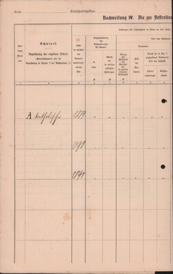 Im Nachweis IV. diente dazu alle zur Bestreitung der sächlichen Kosten der öffentlichen Volks- und Mittel- sowie der höheren Mädchenschulen erfordernden Aufwendungen für die Jahre 1889, 1890 und 1891 pro Jahr zu erfassen. Auf Seite 1 ist beschrieben wie und was zu erfassen sei. Im Innenteil in Spalte 2 die Art der Schule, Spalte 22 ist der Gesamtbetrag der sonstigen fachlichen Aufwendungen und in den folgenden Spalten 23 und 25 die Aufteilung von wo die Aufwendungen bestritten wurden. Spalte 23 erfasst Schul-, Kirchen- und Stiftungsvermögen und Spalte 25 die von der Gemeinde aufgebrachten Mittel.