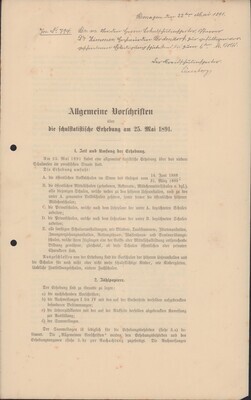 In der Allgemeinen Vorschrift werden die Rektoren der Schulen darüber in Kenntnis gesetzt wie die schulstatische Erhebung vom 25. Mai 1891 zu handhaben ist. Auf Seite 1 hat der Kreisschuldirektor aus Remagen, Lünenburg, mit Datum 22. Mai 1891 weitere handschriftliche Anweisungen an den Bodendorfer Pfarrer Dr. Zimmer vermerkt.