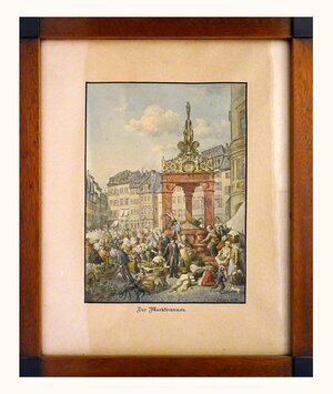 Der Marktbrunnen steht dominant im Zentrum des Bildes. Markttag in Mainz mit Marktbeschickern und Gemüseprodukten, Dienstleuten, Käufern und Bürgern, Kindern mit Hunden. Im Hintergrund die Markthäuser, die den Markt enger als heute umschließen. Vor dem Brunnen ein Bürger in dunklem Anzug, dem von mehreren Seiten Gemüseprodukte angeboten werden. Motiv vor 1900.
