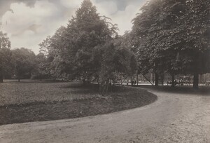Schwarzweißfotografie. Diese Aufnahme entstand in den 1930er Jahren und zeigt den eingezäunten ehemaligen Tennisplatz mit einigen Leuten im Stadtpark Bendorf. Der heutige Stadtpark ist der einstige Anstaltspark der Dr. Erlenmeyer'schen Heilanstalten und die Tennisplätze waren für die Kranken zur sportlichen Betätigung angelegt worden. Im Jahre 1922 gingen die Gebäude und Anlagen an der Hauptstraße in den Besitz der Stadt Bendorf über. Die Gebäude beherbergen die beiden Rathäuser I und II, als Sitz der Stadtverwaltung Bendorf.