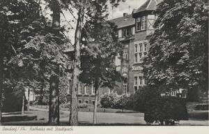 Schwarzweißfotografie als Postkarte. Diese Aufnahme zeigt den Auftritt des Männergesangvereins vor dem Bürgermeisteramt (heute Rathaus I) im Stadtpark Bendorf. Das Gebäude wurde im Jahr 1903 erbaut und war ursprünglich die "Damen-Villa" der Dr. Erlenmeyer'schen Anstalten für Gemüts- und Nervenkranke. Im Jahr 1922 gingen die Gebäude und Anlagen der Heilanstalt in den Besitz der Stadt Bendorf über. An jener Stelle beherbergen die beiden Rathäuser I und II bis heute die Stadtverwaltung der Stadt Bendorf. Der heutige Stadtpark ist der einstige Anstaltspark der Dr. Erlenmeyer'schen Heilanstalten.