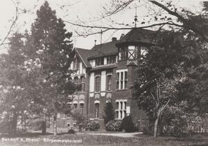 Schwarzweißfotografie als Postgkarte. Diese Aufnahme entstand im Jahr 1930 und zeigt das Rathaus I (Bürgermeisteramt) im Stadtpark Bendorf. Das Gebäude wurde im Jahr 1903 erbaut und war ursprünglich die "Damen-Villa" der 1848 gegründeten Dr. Erlenmeyer'schen Anstalten für Gemüts- und Nervenkranke. Im Jahre 1922 gingen die Gebäude und Anlagen der Heilanstalt in den Besitz der Stadt Bendorf über. An jener Stelle beherbergen die beiden Rathäuser I und II bis heute die Stadtverwaltung der Stadt Bendorf. Der heutige Stadtpark ist der einstige Anstaltspark der Dr. Erlenmeyer'schen Heilanstalten.