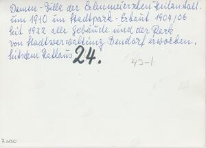 Schwarzweißfotografie. Diese Aufnahme entstand im Jahr 1910 und zeigt das heutige Rathaus I (Bürgermeisteramt) im Stadtpark Bendorf. Das Gebäude wurde im Jahr 1903 erbaut und war ursprünglich die "Damen-Villa" der 1948 gegründeten Dr. Erlenmeyer'schen Anstalten für Gemüts- und Nervenkranke. Auf dieser Aufnehme erkennt man noch die Einzäunung des Gebäudes und eine Person, die auf einer Parkbank sitzt (rechter Bildrand). Im Jahre 1922 gingen alle Gebäude und Anlagen der Heilanstalt in den Besitz der Stadt Bendorf über. An jener Stelle beherbergen die beiden Rathäuser I und II bis heute die Stadtverwaltung der Stadt Bendorf. Der heutige Stadtpark ist der einstige Anstaltspark der Dr. Erlenmeyer'schen Heilanstalten.
