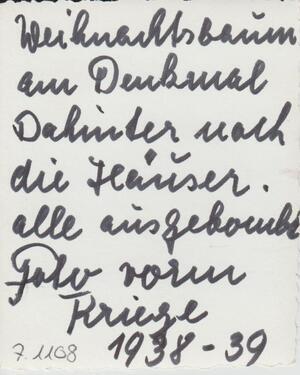Schwarzweißfotografie. Das Foto wurde im Winter 1938/39 bei Schnee aufgenommen und zeigt einen Teil der vorderen Stadtparkanlagen mit dem Kriegerdenkmal für die Gefallenen des Ersten Weltkriegs an der Hauptstraße in Bendorf. Im Hintergrund zu sehen sind die ehemaligen Vorderfgebäude der Dr. Erlenmeyer'schen Heilanstalten, welche im zweiten Weltkrieg am 31.12.1944 zerstört wurden. Der heutige Stadtpark ist der ehemalige Anstaltspark der Dr. Erlenmeyer'schen Heilanstalten für Nerven- und Gemütskranke. Im Jahre 1922 gingen alle Gebäude und Anlagen des Sanatoriums an der Hauptstraße in den Besitz der Stadt Bendorf über. Bis heute beherbergen die beiden Rathäuser I und II im Stadtpark (vormals die "Herren- und Damen-Villa" des Sanatoriums) die Stadtverwaltung der Stadt Bendorf.