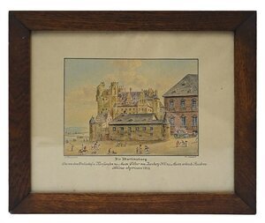 Die Martinsburg. Das von dem Erzbischof und Kurfürsten Dither von Isenburg 1481 zu Mainz erbaute Residenzschloß, abgerissen 1806. (nach Kesselstatt) Im Zentrum des Bildes das burgähnliche Residenzschloß, im Vordergrund verschiedene Personen: Soldaten zu Pferd, Bürger, Kinder und Dienstleute. Soldaten scheinen in einer Kutsche eine Person aus dem Schloß wegzubringen. Im Hintergrund wohl der Rhein und der Taunus.