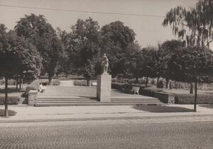 Schwarzweißfotografie. Diese Aufnahme aus dem Jahre 1952/53 zeigt die vorderen Stadtparkanlagen mit dem Kriegerdenkmal für die Gefallenen des Ersten Weltkriegs im Zentrum der Stadt Bendorf am Rhein. Gelegen an der Hauptstraße, welche zu damaliger Zeit noch mit Pflastersteinen und Straßenbahnschienen versehen war. Der heutige Stadtpark ist der einstige Anstaltspark der Dr. Erlenmeyer'schen Heilanstalten für Gemüts- und Nervenkranke.Im Jahre 1922 gingen alle Gebäude und Anlagen des Sanatoriums an der Hauptstraße in den Besitz der Stadt Bendorf über. Bis heute beherbergen die beiden Rathäuser I und II im Stadtpark (vormals die "Herren- und Damen-Villa" des Sanatoriums) die Stadtverwaltung der Stadt Bendorf.