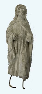 Bei der schmalhochrechteckigen Ofenplatte handelt es sich um die Stirnplatte eines Kastenofens. Die Oberfläche ist stark beschädigt, wurde wahrscheinlich auch sandgestrahlt. In einem oben rund geschlossenen Rahmen ist der Erzengel Michael zu erkennen, der mit seiner Lanze den Teufel in Gestalt eines Drachens tötet.