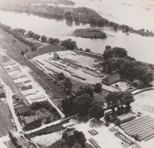 Schwarzweißfotografie. Dieses Luftaufnahme zeigt den Bendorfer Rheinhafen mit seinen, für die damalige Zeit charakteristischen, Schwemmsteinbetrieben. Aufgrund des reichen Bimsvorkommens und der Hochkonjunktur entstanden in Bendorf zahlreiche Bimsbetriebe. Der Rheinhafen Bendorf ist ein Stromhafen in Bendorf und erstreckt sich von Rheinkilometer 598,90 bis 599,875 rechts. Auf dem Bild zu sehen ist die ehemalige in den 1950er Jahren entstandene Schwemmsteinfabrik Übbing (auf diesem Gelände wurde 1969 das Rheinstadion erbaut) sowie die heute ebenfalls nicht mehr existierende Bimssteinfabrik Vogel. Im Hintergrund ist die Insel "Graswerth" und die Sandbank, genannt "der Placken" zu sehen.