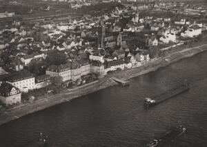 Schwarzweißfotografie. Diese Luftaufnahme zeigt die Rheinpromenade von Engers (Neuwied) mit Blick auf das Heinrich-Haus und auf das "Schloss Engers". Im Jahr 1990 wurde das Schlossgebäude vom Land Rheinland-Pfalz übernommen und beheimatet seit 1995 die Landesstiftung Villa Musica, einen Museumsbereich mit alten Musikinstrumenten und Gemälden kurtrierischer Fürsten sowie im Schlosskeller ein Restaurant. Im 2003 renovierten Gebäude befindet sich die Landesmusikakademie Rheinland-Pfalz. Im Hintergrund zu sehen sind die beiden Bendorfer Stadtteile Mülhofen und Sayn.
