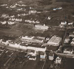 Schwarzweißfotografie. Diese Luftaufnahme zeigt die ehemalige Remynol-Fabrik (Farben und Lackfabrik) in der Vallendarer-Strasse in Bendorf, gegründet im Jahre 1863 von Friedrich Wilhelm Remy (1840-1895) auf dem Werksgelände einer ehemaligen bayrischen Bierbrauerei. Rechterhand liegt die um das Jahr 1930 entstandene Siedlung "Im Ohlenberg" und die Autobahnabfahrt auf die A 48 Richtung Trier. Im Hintergrund sind Neubergsweg und dahinter die Vierwindenhöhe zu erkennen. Die Remynol-Fabrik produzierte Bleiweiß- und Mennigeprodukte, die Remy als Rostschutz für die in seinen Eisenhütten hergestellten Metallwaren benötigte. Trotz totaler Demontage nach dem Zweiten Weltkrieg konnten die Remynol-Werke bereits 1953 wieder ein breit gefächertes Produktionsprogramm bestehend aus Bleiweiß, Bleimennige, Bleiglätte, Lacke und Rostschutzfarbe anbieten.1956 wurden die Remynol-Werke von der Firma Sanapol erworben, die wiederum in die Deutsche Akzo Coating GmbH und schließlich an PolyOne Color & Additives Germany GmbH überging. Heute liegt das Gelände brach und ein Investor plant ein neues Wohngebiet auf dem ehemaligen Firmengelände.