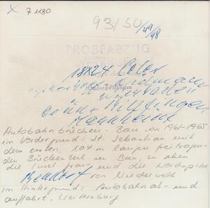 Schwarzweißfotografie. Diese Luftaufnahme zeigt Baumaßnahmen während der Errichtung der Autobahnbrücke in Bendorf. Im Vordergrund zu sehen ist die Ortschaft St. Sebastian, mit dem ersten, 104 m langen, freitragenden Brückenteil. Außerdem sichtbar sind die Insel "Graswerth" und die Vorderspitze der Insel Niederwerth. Im Hintergrund die Autobahnauf- und abfahrt Weitersburg. Die Bendorfer Brücke, auch "Rheinbrücke Bendorf" genannt, führt die Autobahn A 48 zwischen Koblenz und Bendorf über den Rhein. Die 1029 m lange Brücke beginnt an der nördlichen Stadtgrenze von Koblenz, überquert die beiden Arme des Rheins und das nördliche Ende der Insel Graswerth, die zur Gemeinde Niederwerth gehört, und endet an der Anschlussstelle Bendorf/Neuwied. Mit den Bauarbeiten wurde am 15. März 1962 begonnen. Die Flussbrücke mit der größten Spannweite wurde am 21. August 1964 und die restliche Brücke am 13. August 1965, nach einer gesamten Bauzeit von über drei Jahren, fertiggestellt und 3 Tage später für den Verkehr freigegeben. Die Baukosten betrugen damals 27,13 Millionen DM, was heute rund 56 Millionen Euro entspricht.