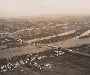 Schwarzweißfotografie. Diese Luftaufnahme zeigt Baumaßnahmen während der Errichtung der Autobahnbrücke in Bendorf. Im Vordergrund zu sehen ist die Ortschaft St. Sebastian, mit dem ersten, 104 m langen, freitragenden Brückenteil. Außerdem sichtbar sind die Insel "Graswerth" und die Vorderspitze der Insel Niederwerth. Im Hintergrund die Autobahnauf- und abfahrt Weitersburg. Die Bendorfer Brücke, auch "Rheinbrücke Bendorf" genannt, führt die Autobahn A 48 zwischen Koblenz und Bendorf über den Rhein. Die 1029 m lange Brücke beginnt an der nördlichen Stadtgrenze von Koblenz, überquert die beiden Arme des Rheins und das nördliche Ende der Insel Graswerth, die zur Gemeinde Niederwerth gehört, und endet an der Anschlussstelle Bendorf/Neuwied. Mit den Bauarbeiten wurde am 15. März 1962 begonnen. Die Flussbrücke mit der größten Spannweite wurde am 21. August 1964 und die restliche Brücke am 13. August 1965, nach einer gesamten Bauzeit von über drei Jahren, fertiggestellt und 3 Tage später für den Verkehr freigegeben. Die Baukosten betrugen damals 27,13 Millionen DM, was heute rund 56 Millionen Euro entspricht.