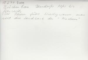 Schwarzweißfotografie. Diese Luftaufnahme zeigt Baumaßnahmen während der Errichtung der Autobahnbrücke in Bendorf. Im Bild sichtbar das Bendorfer Rheinufer und unter der Brücke aufgrund des Niedrigwassers sichtbar ist die Sandbank, genannt der "Placken". Die Bendorfer Brücke, auch "Rheinbrücke Bendorf" genannt, führt die Autobahn A 48 zwischen Koblenz und Bendorf über den Rhein. Die 1029 m lange Brücke beginnt an der nördlichen Stadtgrenze von Koblenz, überquert die beiden Arme des Rheins und das nördliche Ende der Insel Graswerth, die zur Gemeinde Niederwerth gehört, und endet an der Anschlussstelle Bendorf/Neuwied. Mit den Bauarbeiten wurde am 15. März 1962 begonnen. Die Flussbrücke mit der größten Spannweite wurde am 21. August 1964 und die restliche Brücke am 13. August 1965, nach einer gesamten Bauzeit von über drei Jahren, fertiggestellt und 3 Tage später für den Verkehr freigegeben. Die Baukosten betrugen damals 27,13 Millionen DM, was heute rund 56 Millionen Euro entspricht.
