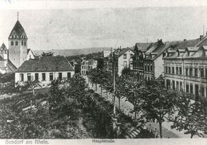 Schwarzweißfotografie. Dieses Bild, aufgenommen um das Jahr 1910, zeigt die obere Hauptstrasse in Bendorf mit Blick auf die Medardus Kirche. Im Vordergrund zu sehen ist die ehemalige katholische "Kinderverwahrschule". Davor noch sichtbar ist der "Plenzerpfad", welcher in den 1920er Jahren zur Bahnhofstraße ausgebaut wurde. In der Mitte im Hintergrund dargestellt ist das Haus von Johann Kahn, welches dem Luftangriff auf Bendorf am 31.12.1944 zum Opfer fiel.