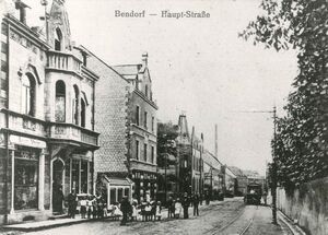 Schwarzweißfotografie. Diese Aufnahme entstand um das Jahr 1907 und zeigt die alte Hauptstraße in Bendorf. Auf der linken Seite ist das ehemalige Haus "Wepler-Textilien" zu erkennen, wo später die Deutsche Bank ansässig war. Die Mauer rechts im Bild umfasste den Park mit Gebäuden der ehemaligen Dr. Erlenmeyer'schen Heilanstalten. Seit dem Jahr 1922 befindet sich an jenem Ort der Stadtpark mit seinen beiden Rathäusern.