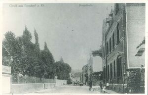 Schwarzweißfotografie. Das Foto wurde um 1910 aufgenommen und zeigt die Hauptstraße in Bendorf auf der Höhe der Poststraße. Auf der linken Seite sind die Gartenanlagen der Dr. Erlenmeyer'schen Nervenheilanstalten zu sehen. Seit 1922 befindet sich dort der Bendorfer Stadtpark mit seinen beiden Rathäusern. Rechts im Bild sichtbar ist das alte Postgebäude. Im Hintergrund erkennt man die Straßenbahn.