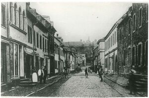 Schwarzweißfotografie. Diese Aufnahme entstand um das Jahr 1900 und zeigt die gepflasterte Hauptstraße in Bendorf mit Blick stadtauswärts Richtung Friedhof. Auf der rechten Straßenseite sind die ehemaligen Wohnhäuser der Familien Tielemann (später "4 Türme" und Standort der Dr. Althoff'schen Apotheke) und Eifler (späteres Café Jubelius & Textilgeschäft Prüm) zu erkennen. Auf der linken Seite blickt man auf das ehemalige Schuhhaus Schaffer und den einstigen Friseursalon Dähne. Hoch oben auf dem Berg im Hintergrund kann man den Schornstein der Erzgrube "Vierwinde" erkennen.