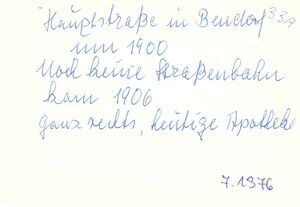 Schwarzweißfotografie. Diese Aufnahme für eine Postkarte entstand um das Jahr 1900 und zeigt die Hauptstrasse in Bendorf mit Blick stadtauswärts Richtung Friedhof. Auf der rechten Straßenseite sind die einstigen Häuser Tielemann und Eifler (heutiger Standort der Dr. Althoff'schen Apotheke), das Geschäft "4 Türme", das Café Jubelius und das Textilgeschäft Prüm zu erkennen. Auf der linken Seite stand das ehemalige Schuhhaus Schaffer und der Friseursalon Dähne. Hoch oben auf dem Berg im Hintergrund kann man den Schornstein der Erzgrube "Vierwinde" erkennen. Die Postkarte ist auf der Vorderseite beschrieben worden.