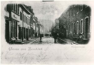Schwarzweißfotografie. Diese Aufnahme für eine Postkarte entstand um das Jahr 1900 und zeigt die Hauptstrasse in Bendorf mit Blick stadtauswärts Richtung Friedhof. Auf der rechten Straßenseite sind die einstigen Häuser Tielemann und Eifler (heutiger Standort der Dr. Althoff'schen Apotheke), das Geschäft "4 Türme", das Café Jubelius und das Textilgeschäft Prüm zu erkennen. Auf der linken Seite stand das ehemalige Schuhhaus Schaffer und der Friseursalon Dähne. Hoch oben auf dem Berg im Hintergrund kann man den Schornstein der Erzgrube "Vierwinde" erkennen. Die Postkarte ist auf der Vorderseite beschrieben worden.