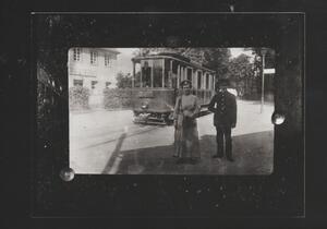 Schwarzweißfotografie. Diese Aufnahme aus dem Jahr 1916 zeigt die Endhaltestelle "Sayn Schloßstraße" der seit dem Jahr 1906 zwischen Koblenz und Sayn fahrenden elektrischen Straßenbahn, deren Betrieb im Jahr 1955 eingestellt wurde. Im Hintergrund erkennbar ist die Gaststätte "Zur Burg Sayn". Der vor dem Wagon stehende Schaffner ist der Vater von Frau Luci Weber aus Vallendar, damals wohnhaft in der Rheinstraße in Bendorf.