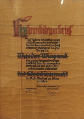 Schwarzweißfotografie. Diese Aufnahme entstand am 31. Januar 1983 und zeigt Mitarbeiter der Stadt Bendorf beim Anbringen des Straßenschildes in der Wiegandstraße. Linksneben der Leiter stehen u.a. der damalige Bürgermeister Dieter Trennheuser und Kulturdezernent Gerd Saxer. Die Wiegandstraße ist benannt nach dem Archäologen und Ehrenbürger der Stadt Bendorf Dr. Theodor Wiegand (1864-1936). Der im Jahre 1864 in Bendorf geborene Dr. Theodor Wiegand war Schöpfer des Pergamon Museums.