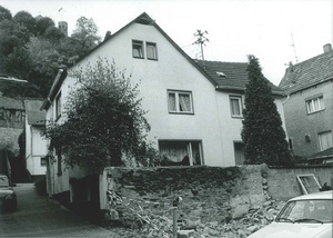 Schwarzweißfotografie. Diese Aufnahme zeigt das ehemalige Geschäftshaus Fuchs-Eckstein an der Hauptstraße Ecke Obere Bachstraße in Bendorf. Dieses Gebäude war das ehemalige Wohnhaus der Familie Moritz Feist.