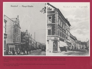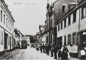 Schwarzweißfotografie. Dieses Bild zeigt die alte Hauptstraße in Bendorf. Am linken vorderen Bildrand ist das Hotel "Nassauer Hof" und auf der gegenüberliegenden Straßenseite ein Schreibwarenhandel zu erkennen (Hauptstraße Ecke Steinstraße). Außerdem ist die seit dem Jahr 1906 bis nach Sayn fahrende elektrische Straßenbahn, deren Betrieb im Jahr 1955 eingestellt wurde, abgebildet. Die Leute auf der Straße scheinen auf die Ankunft der Straßenbahn zu warten.