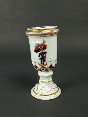 Der Pokal hat etwa die Größe eines Stengelglases. Er ist von einer Burschenschaft. Er hat einen runden Hohlfuss, der sich zum sechseckigen Nodus hin mit gotischem Maßwerkmotiv leicht sechseckig verzieht. Das Gefäß ist becherartig, nach unten gerundet und hier mit purpur-rot und schwarz gefülltem Lilien-Maßwerk gefasst. Auf der Schauseite die Aufschrift "Ehre, Freiheit, Vaterland". Umrandet von Eichenzweigen: "IX. XXI 113 18 VI. 15 12". Den Abschluss oben macht ein Eichenlaubkranz und ein Goldrand. Oben innen ist eine breite Goldzone. Die Form ist gedrückt, leicht schief. Auf der anderen Seite ein Burschenschaftler mit Degen und erhobener Deutschlandfahne an einer Lanze. Auf dem Kopf ein Hut mit drei Federn. Über seiner schwarzen Kleidung trägt er eine rote Schärpe.