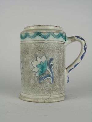 Die Zylinderform ist oben eingezogen, unten etwas ausladend. Die Mittelzone ist grau gesprenkelt. Auf der Schauseite ist, zwischen zwei blauen Zweigen, eine Ansicht einer Kirche mit gelbem Turm. Die Kirche hat ein grünes Kuppeldach und ist umgeben von zwei Bäumen. Auf der gegenüberliegenden Seite ist eine einfach stilisierte Blume. Den oberen Rand umgibt ein einfaches Girlandenmotiv in türkis. Der Henkelrücken ist mit kräftigen blauen, fortlaufenden Schnecken bemalt. Der ursprüngliche Zinndeckel mit Scharnier am Henkel fehlt. Auf dem Boden ist eine kräftige Blaumarke: SI : Hanau.