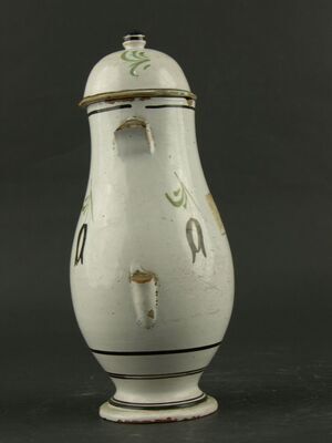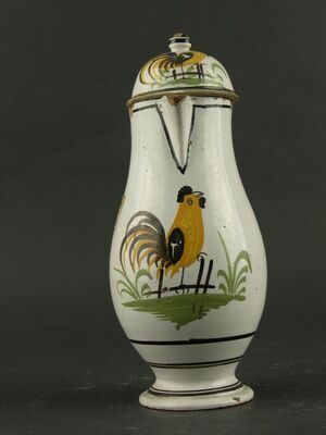 Das schlanke Kännchen wird betont durch zahlreiche schwarze Linien, besonders am Fuß. Die Schauseite zeigt einen gelb-braunen Hahn in Bauernmalerei, gelb und braun, auf grünem Boden und Grasbewuchs sitzend. Das gleiche Motiv ist auch auf dem Deckel. Seitlich des Henkels sind zwei überkopf hängende Blüten.