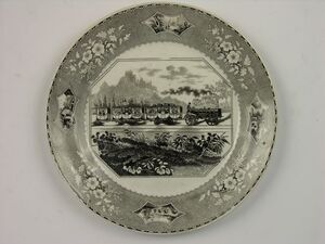 Zier- und Andenkenteller mit der Darstellung der ersten kontinentaleuropäischen Eisenbahn. Im Spiegel, innerhalb eines Querrechtecks mit abgeschrägten Ecken, zeigt sich die nach rechts fahrende vollbesetzte Eisenbahn, auf deren Wagen die Bezeichnungen "Anvers" [= Antwerpen], "Bruxelles" [= Brüssel] und noch einmal "Anvers" zu sehen sind. Im Hintergrund erhebt sich auf einem Berg eine Burg. Der Rand ist verziert mit vier rhombisch umgrenzten Landschaftsausschnitten mit einzelnen Gebäuden sowie dazwischen vier Blumenarrangements innerhalb der gepunkteten Randzone. Der Druck ist in grauschwarzer Farbe erfolgt. Der Teller bezieht sich auf die Eisenbahnstrecke zwischen Brüssel und Antwerpen, die ab dem 3.5.1836 durchgängig befahrbar war. Auf dem Boden befindet sich ein Stempel mit Herstellerangabe und Angabe des Herstellungsortes: "V & B / Vaudrevange". [V & B = Villeroy und Boch; Vaudrevange = Wallerfangen]. Der Teller dürfte als Andenkenteller um 1836-1850 entstanden sein. [Ludger Tekampe]