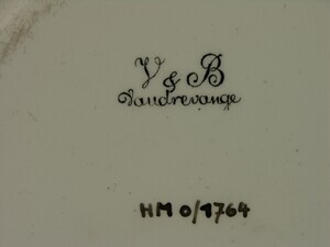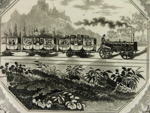 Zier- und Andenkenteller mit der Darstellung der ersten kontinentaleuropäischen Eisenbahn. Im Spiegel, innerhalb eines Querrechtecks mit abgeschrägten Ecken, zeigt sich die nach rechts fahrende vollbesetzte Eisenbahn, auf deren Wagen die Bezeichnungen "Anvers" [= Antwerpen], "Bruxelles" [= Brüssel] und noch einmal "Anvers" zu sehen sind. Im Hintergrund erhebt sich auf einem Berg eine Burg. Der Rand ist verziert mit vier rhombisch umgrenzten Landschaftsausschnitten mit einzelnen Gebäuden sowie dazwischen vier Blumenarrangements innerhalb der gepunkteten Randzone. Der Druck ist in grauschwarzer Farbe erfolgt. Der Teller bezieht sich auf die Eisenbahnstrecke zwischen Brüssel und Antwerpen, die ab dem 3.5.1836 durchgängig befahrbar war. Auf dem Boden befindet sich ein Stempel mit Herstellerangabe und Angabe des Herstellungsortes: "V & B / Vaudrevange". [V & B = Villeroy und Boch; Vaudrevange = Wallerfangen]. Der Teller dürfte als Andenkenteller um 1836-1850 entstanden sein. [Ludger Tekampe]