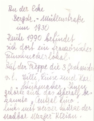 Schwarzweißfotografie. Dieses Bild, aufgenommen in den 1930er Jahren, zeigt den Gasthof "Erholung", gelegen an der Bergstraße Ecke Mühlenstraße in Bendorf. Auf der Treppe stehend zu erkennen sind die drei Geschwister und Inhaber des Gasthofes Luise, Willi und Karl Schuhmacher. Ihnen gehörte auch das direkt neben dem Gasthof ansässige Bendorfer Zentralkino. Ganz links abgebildet mit der weißen Schürze am Treppengeländer lehnend ist Metzgermeister und Nachbar Kilian.