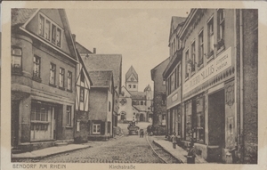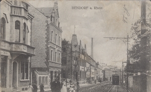 Es handelt sich hierbei um eine Schwarzweiß-Postkarte mit zwei darauf abgebildeten Bildmotiven aus der Zeit um 1910. Die obere Aufnahme zeigt den Engersport in Bendorf und im Hintergrund die 1903 erbaute Apotheke, welche im Jahr 1909 von Apotheker Dr. Althoff übernommen wurde. Am vorderen rechten Bildrand ist das ehemalige Casinogebäude sichtbar und auf der linken Seite stehen die ehemaligen Häuser Cattepool und Stellmacher in denen später das Weinhaus Sryé untergebracht war. Heute befindet sich darin das Jobcenter der Stadt Bendorf. Die untere Aufnahme zeigt die Bachstraße in Bendorf mit vielen Passanten. Die Postkarte ist in der Mitte beschriftet mit "Bendorf a. Rhein".