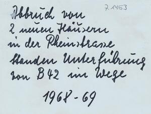 Schwarzweißfotografie. Diese Aufnahme aus dem Jahr 1968/69 zeigt den Abriss zweier Wohnhäuser in der Rheinstraße in Bendorf, die dem Bau der Unterführung der Bundesstraße B 42 weichen mussten.