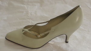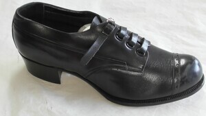 Ein einzelner Pumps aus schwarzem Leder. Spitze Form, lederbezogener Pfennigabsatz (ca. 5cm) mit Metallspitze. Der Schuh ist mit Ziernähten und sehr feinen Zierlochungen versehen. Hergestellt von der Firma Salamander in Kornwestheim (D). Leider sehr ungenau datiert.