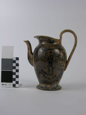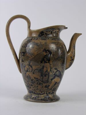 Die Kaffeekanne ist in etwa ovalförmig. Geformt ist sie mit einem hochgezogenen Henkel, der in den oberen Rand, welcher sich kannenartig nach vorne schiebt, einmündet. Das leicht s-förmige Ausgussrohr ähnelt der Brust und Halspartie einer Gans. Der Aufdruck ist blau. Es sind zwei unterschiedliche Szenen dargestellt. Eine Seite zeigt vier Männer. Drei sitzen und einer steht. Sie essen gerade eine Mahlzeit, sitzend auf einer Wiese, umgeben von Bäumen. Vor ihnen liegt das Picknick ausgebreitet. Einer der sitzenden Männer hält eine Flasche in der Hand und reicht dem stehenden Mann ein Glas. Auf der anderen Seite ist ein ruhender Jäger, der sich locker an einen Baum lehnt und ein stehender Jäger, der sich mit beiden Händen auf sein Gewehr abstützt, zu sehen. Im Vordergrund sind zwei Jagdhunde. Den Ausguss ziert ein florales Stillleben, den oberen Rand zwei Hunde.