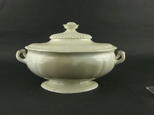 Etwa runde Terrine, im Umriss gebuckelt und bewegt. Durch vier über Deckel, Gefäß und Fuß durchlaufende, erhabene Streifen in vier Felder eingeteilt, die auf dem Deckel und am Gefäß mit relief. Blütenwerk gefüllt sind. In ihnen auch die Griffe, die wie aus vier Bambusstückchen (knotige Gliederteilung) zusammengesetzt erscheinen. Oben auf dem Deckel ein Pinienzapfen-Griff, über vier hohlstehenden Blättern stehend. Schlechter Stand.